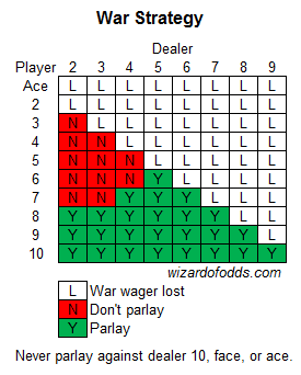 Seuraava taulukko näyttää blackjack-panoksen odotusarvon pelaajan alkuperäisen kortin ja jakajan kuvapuoli ylöspäin olevan kortin perusteella ainoastaan voittavissa War-panoksissa. Pöytä perustuu äärettömiin pakoihin, joissa jakaja saa pehmeän 17, tuplaus jaon jälkeen on sallittu ja antautuminen on sallittu. Taulukossa oleva "häviö" tarkoittaa, että pelaaja hävisi panoksen, joten hänen ei tarvitse tehdä yhdistelmäpäätöstä. Pelaajan tulisi yhdistelmäpanostaa voittava War-panos missä tahansa tilanteessa, jossa odotusarvo on positiivinen.