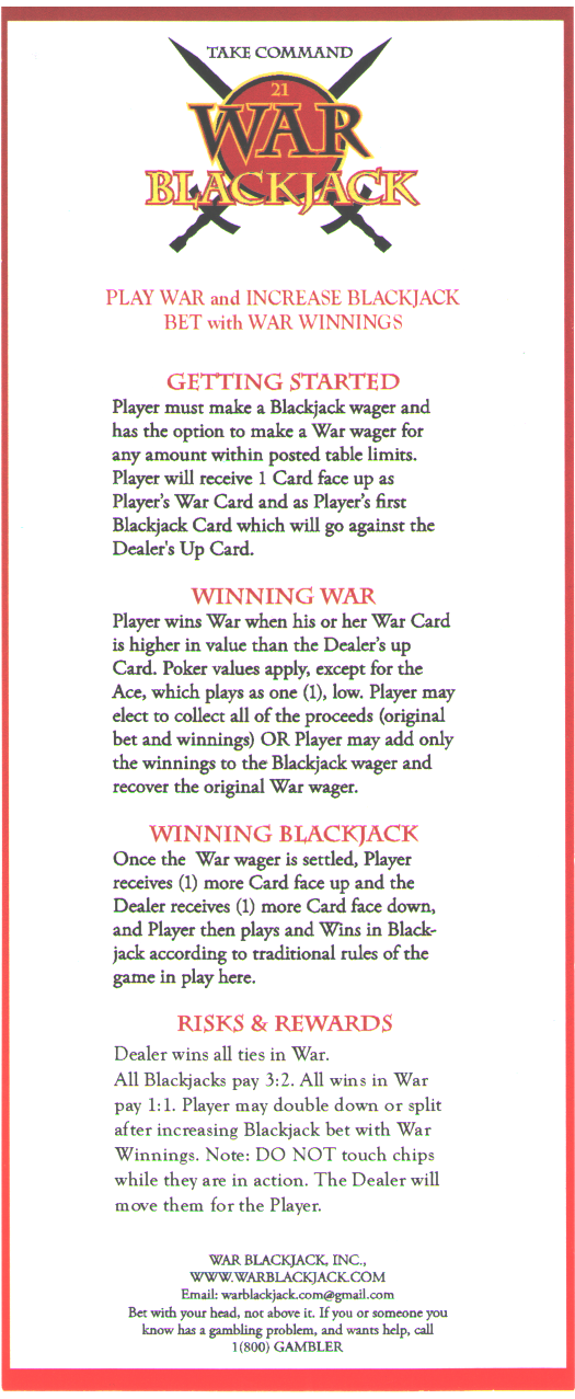 Näin War Blackjackin ensimmäisen kerran Downtown Grandissa Las Vegasissa 9. toukokuuta 2014. Minulle kerrottiin, että sitä oli pelattu jo silloin Carson City Nuggetissa ja Eurekassa Mesquitessa. Peli on yhdistelmä Waria ja Blackjackia. Juttu on siinä, että jos pelaaja voittaa War-panoksen, hän voi parantaa voittoaan blackjack-panoksellaan tietäen jo ensimmäisen korttinsa ja jakajan näkyvän kortin.