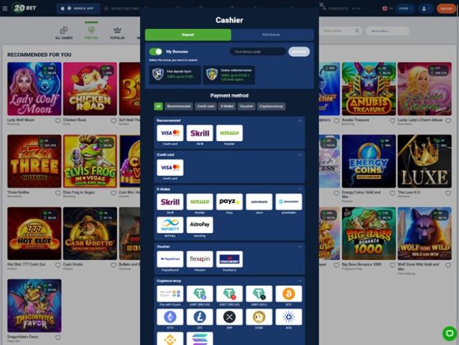 20Bet Casinon takana on Microgaming, Net Entertainment, Playtech, BetSoft, 1x2gaming, Amatic Industries, Big Time Gaming, ELK Studios, Evolution Gaming, EYECON, Ezugi, Genesis Gaming, Novomatic, Oryx, Play'n GO, playson, Quickspin, Relax Gaming, Thunderkick, Yggdrasil, Endorphina, Wazdan, GameArt, Booming Games, Pragmatic Play, Nolimit City, Red Tiger Gaming, Booongo, LuckyStreak, Spinomenal, Felix Gaming, Red Rake Gaming, Skillzzgaming, Fugaso, Belatra Games, Fantasma Games, FunFair, Platipus Gaming, Skywind, Spinmatic, Spadegaming, Triple Edge Studios, BGAMING, Northern Lights Gaming, Evoplay, Stormcraft Studios, Switch Studios, OneTouch, Pocket Games Soft, All41 Studios, Gluck Games, Mascot Gaming, TVBet, NetGame Entertainment, Gameburger Studios, Slot Factory, Neon Valley Studios, Golden Rock Studios, Spearhead Studios, Swintt, TrueLab Games, SpinPlay Games, Mancala Gaming, Expanse Studios, 7Mojos, SmartSoft Gaming, KA Gaming, Real Dealer Studios, GONG Gaming, On Air Entertainment, Buck Stakes Entertainment, Caleta Gaming, Games Global, Amusnet Interactive, Ainsworth, Ash Gaming, CT Interactive, EveryMatrix, Greentube, Leander Games, Push Gaming, Tom Horn Gaming, Gamomat, Noble Gaming, BF Games, Bally Wulff, Old Skool Studios, Foxium, Just For The Win, Wild Streak Gaming, Slingshot Studios, Fortune Factory Studios, RubyPlay, AvatarUX, Gamevy, Crazy Tooth Studio, High 5 Games, ReelPlay, Alchemy Gaming, Rarestone Gaming, Indi Slots, Black Pudding Games, Snowborn Games, Boomerang Studios, Hacksaw Gaming, Max Win Gaming, Gold Coin Studios, Gamzix, Triple Cherry, Peter And Sons, Absolute Live Gaming, Aurum Signature Studios, Onlyplay, Gamebeat, Area Vegas, RAW iGaming, Bombay Live, Leap Gaming, TaDa Gaming, Winfinity, 3 Oaks Gaming, Amigo Gaming, Wishbone Games, Spribe, Circular Arrow, 1spin4win, Gaming Corps, BetSolutions, Nailed It! Games, Neko Games, Reel Kingdom, Oros Gaming, JVL, Indigo Magic, Popiplay, Live88, ICONIC21, Galaxsys, Penguin King and Octoplay , ja sivustolla on verkkopohjainen käyttöliittymä, johon pääset internetselaimellasi. Sivusto on hyvin suunniteltu ja helppokäyttöinen, ja siinä on eri välilehdet vedonlyöntisivustolle, kasinolle ja live-jakajakasinolle. Myös mobiilituki on sisäänrakennettu, joten voit pelata puhelimellasi tai tabletillasi.Blackjack