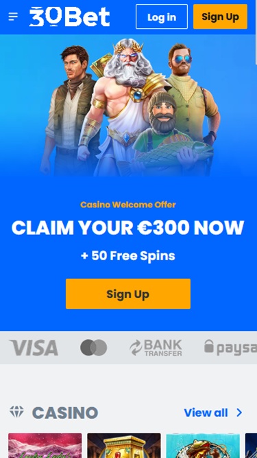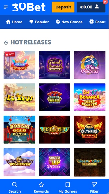 Ennen kuin tarkastelemme kasinotarjontaa tarkemmin, huomioidaan myös, että 30Bet.com on saatavilla kaikilla laitteilla näytön koosta riippumatta, joten voit nauttia kasinosisällöstä liikkeellä ollessasi matkapuhelimellasi tai millä tahansa tietokoneella, riippumatta laitteesi käyttöjärjestelmästä.
