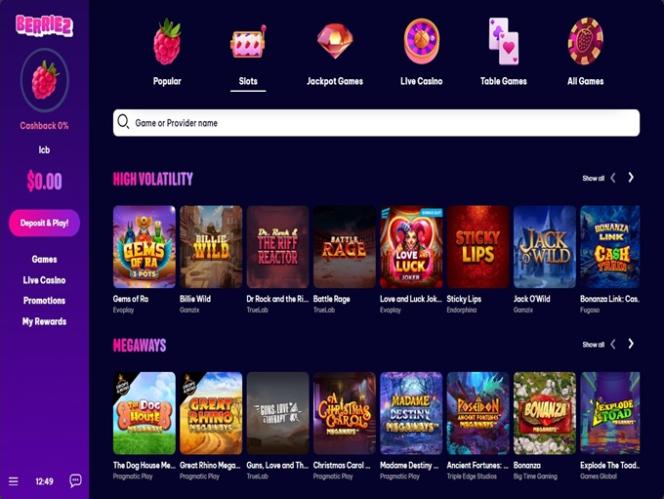 Berriezillä on kattava pelikirjasto, jonka tarjoaa Microgaming, Net Entertainment, BetSoft, Big Time Gaming, Evolution Gaming, EYECON, Habanero Systems, Novomatic, Play'n GO, playson, Relax Gaming, Yggdrasil, Endorphina, Wazdan, Booming Games, Stakelogic, Pragmatic Play, Nolimit City, Red Tiger Gaming, Fugaso, Fantasma Games, Triple Edge Studios, BGAMING, Northern Lights Gaming, Evoplay, Stormcraft Studios, Switch Studios, OneTouch, Electric Elephant Games, Bulletproof Games, All41 Studios, Gluck Games, Gameburger Studios, Pulse 8 Studios, Neon Valley Studios, Golden Rock Studios, TrueLab Games, SpinPlay Games, HungryBear Gaming, Real Dealer Studios, Blue Guru Games, Buck Stakes Entertainment, Caleta Gaming, Games Global, Blueprint Gaming, Greentube, Reel Time Gaming, Iron Dog Studio, Old Skool Studios, Foxium, Just For The Win, Reflex Gaming, PearFiction Studios, Apollo Games, Wild Streak Gaming, Slingshot Studios, Fortune Factory Studios, RubyPlay, 4ThePlayer, AvatarUX, Gamevy, Crazy Tooth Studio, NetGaming, ReelPlay, Alchemy Gaming, Snowborn Games, Boomerang Studios, Hacksaw Gaming, Max Win Gaming, Gold Coin Studios, Gamzix, Slotmill, Peter And Sons, Aurum Signature Studios, Lucksome Gaming, Area Vegas, ELA Games, Aviatrix, 3 Oaks Gaming, Wishbone Games, Spribe, Circular Arrow, Print Studios, Gaming Corps, HammerTime Games, Four Leaf Gaming, INO Games, Nailed It! Games, Neko Games, Reel Kingdom, Oros Gaming, Popiplay, NowNow Gaming, VoltEnt and Kitsune Studios .