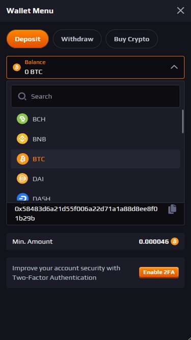 Tämä alusta keskittyy yksinomaan tarjoamaan pelaajille kryptopankkivaihtoehtoja . Asiakkaat voivat käyttää valuuttoja, kuten Bitcoin , Ethereum , Dogecoin , Ripple , Bitcoin Cash , Litecoin , Tether ja Monero . Valitettavasti perinteisiä pankkimenetelmiä ei ole saatavilla.