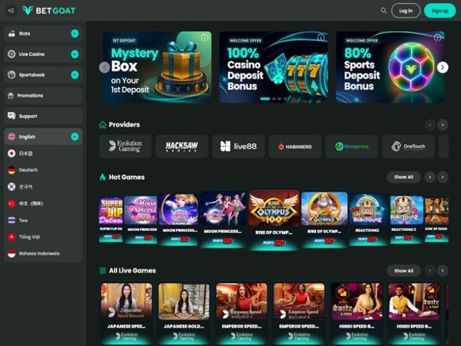 BETGOAT on monipuolinen uhkapelisivusto, joka kutsuu ensisijaisesti pelaajia Aasiasta liittymään, mutta toivottaa tervetulleiksi myös pelaajat Euroopasta ja muualta maailmasta. Brändi tarjoaa kattavan valikoiman kasinopelejä, kuten nettikolikkopelejä, live-jakajapelejä, pöytäpelejä ja crash-pelejä, ja tarjoaa myös yhtä vaikuttavan valikoiman urheiluvedonlyöntivaihtoehtoja, kampanjoita ja bonuksia.