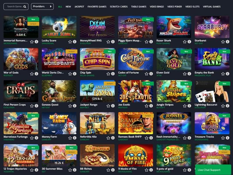 Kaikki täällä näyttää supersiistiltä, ja pelaajilla on mahdollisuus selata sisältöä helposti, joka sisältää yli 8 000 erilaista nimikettä kategorioissa, kuten uudet pelit , jättipotit, bonusostokset, Megaways, Multiways, virtuaalipelit, pöytäpelit, videobingo, videopokeri , videopelikoneet, raaputusarvat, crash-pelit, pikapelit, arcade-pelit, live-pelit ja niin edelleen.