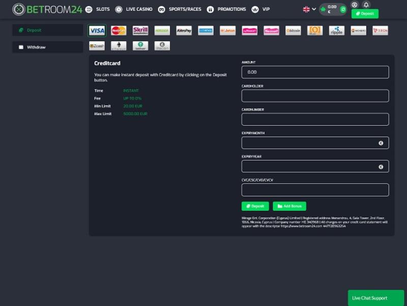 Kuten jo mainitsimme, Betroom24:n verkkosivusto on täynnä arvokasta tietoa. Sivustolta löytyy myös usein kysytyt kysymykset -sivu, josta löytyy lisätietoja peleistä, maksutavoista ja tileistä. Tukitiimiin voi ottaa yhteyttä live-chatin ja sähköpostin kautta.