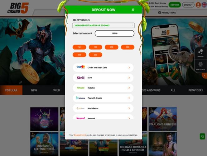 Big5 Casinoa ylläpitää Microgaming, Net Entertainment, BetSoft, Amatic Industries, Big Time Gaming, ELK Studios, Evolution Gaming, iSoftBet, Oryx, Play'n GO, Quickspin, Rabcat, Relax Gaming, Thunderkick, Wazdan, Realistic Games, Booming Games, Pragmatic Play, Red Tiger Gaming, Red Rake Gaming, Kalamba, Spin Games, Triple Edge Studios, Northern Lights Gaming, Stormcraft Studios, Electric Elephant Games, All41 Studios, Gameburger Studios, Neon Valley Studios, Golden Rock Studios, SpinPlay Games, 7Mojos, Games Global, 2by2 Gaming, Merkur Gaming, Tom Horn Gaming, Gamomat, Foxium, Just For The Win, Storm Gaming Technology, Slingshot Studios, Golden Hero, Fortune Factory Studios, 4ThePlayer, Gamevy, Crazy Tooth Studio, Alchemy Gaming, Snowborn Games, Hacksaw Gaming, Max Win Gaming, Gold Coin Studios, Half Pixel Studios, Peter And Sons, Eurostar Studios and Bombay Live , ja kasinon pelit tarjotaan verkkopohjaisen pikapelialustan kautta, joka toimitetaan internetselaimesi kautta. Saatavilla on myös täysi mobiilituki, jonka avulla voit pelata älypuhelimellasi tai tabletillasi.