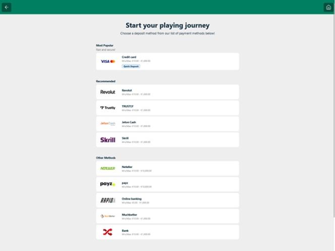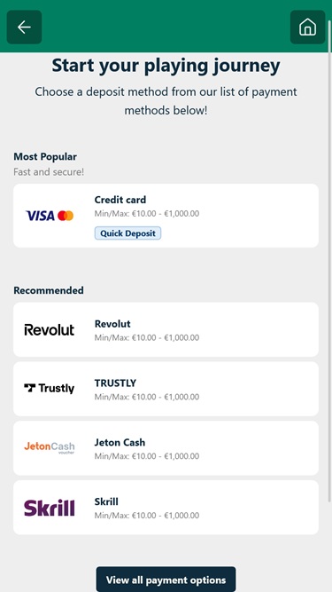 Maksuvaihtoehtojen osalta on tarjolla runsaasti vaihtoehtoja varojen hallintaan, kuten Skrill , Neteller , Apple Pay , pankkisiirto, MuchBetter, Payz , Trustly ja Google Pay . Lisäksi kasino hyväksyy useita kryptovaluuttoja, kuten Bitcoinin , Bitcoin Cashin, Ethereumin , Litecoinin , Tetherin ja Ripplen .