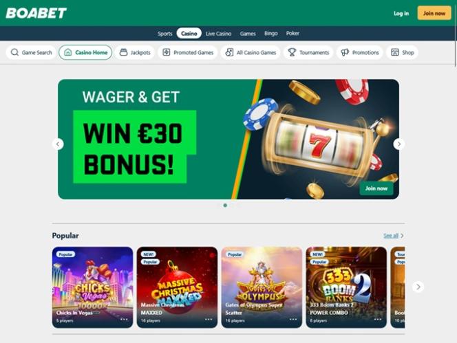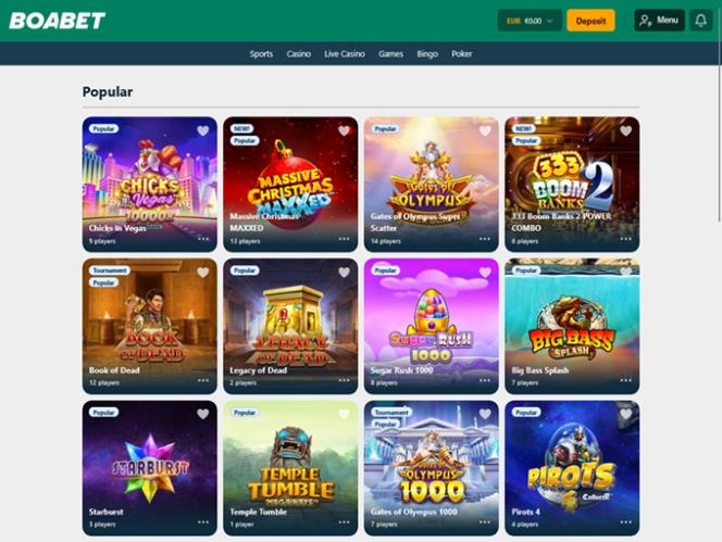 BoaBet on monipuolinen nettikasino, joka painottaa monipuolista kasinopelivalikoimaansa, johon kuuluu kolikkopelejä, live-jakajia, pöytäpelejä, bingoa, kenoa ja raaputusarpoja sekä lukuisia urheiluvedonlyöntivaihtoehtoja. Sivusto on avoin pelaajille Thaimaasta, Vietnamista, Unkarista, Norjasta, Kroatiasta ja Kanadasta, ja se kutsuu heidät pelaamaan kaikkia pelejä ja hyödyntämään palkitsevia kampanjoita ja bonuksia.