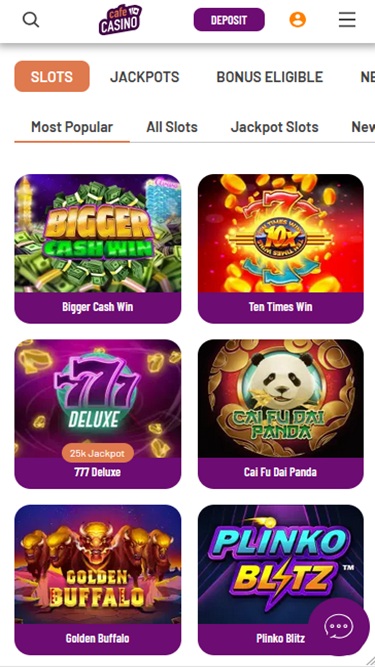 Café Casinolla on pelattavissa suuri määrä videopelikoneita, ja kirjastossa on pelejä RTG:ltä ja TopGamelta. Café Casinolla on saatavilla muutamia progressiivisia jättipotteja, joissa on tarjolla suuria käteispalkintoja onnekkaille. Klassiset pelikoneet tuntuvat jäävän hieman taka-alalle, mutta tarjolla on silti joitakin upeita pelejä.
