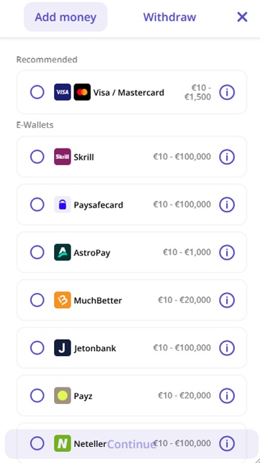 Tuettuihin valuuttoihin kuuluvat Bitcoin , Bitcoin Cash, Ethereum, Litecoin, Ripple, Tether, USD, CAD, EUR, NOK, JPY, INR… Muista, että saatavuus riippuu pelialueestasi, sillä jotkin maksutavat saattavat olla rajoitettuja maassasi nettipelaamisessa.