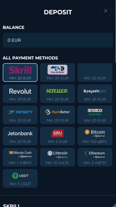 Kasino tarjoaa fantastisen valikoiman maksutapoja , mukaan lukien sekä perinteiset että kryptovaluuttojen menetelmät. Kryptorahapelaamiseen siirtyneet pelaajat voivat tehdä talletuksia ja kotiutuksia suosituilla digitaalisilla valuutoilla, kuten Bitcoin, Bitcoin Cash, Ethereum, Litecoin ja Tether . Kryptovaluuttojen luonteen vuoksi talletustilille ei voida asettaa rajoituksia kryptomaksujärjestelmien kautta tehdyille tapahtumille.