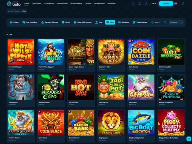 CasinoBellolla on valtava pelivalikoima, joka tarjoaa tuhansia jännittäviä kasinopelejä. Kaikki saatavilla olevat pelit on järjestetty siististi seuraaviin kategorioihin: Aula, Jackpot-pelit, Uudet, Livepelit, Kolikkopelit, Ruletti , Pöytäpelit, Bonusosto, Megaways ja Pikavoitot.