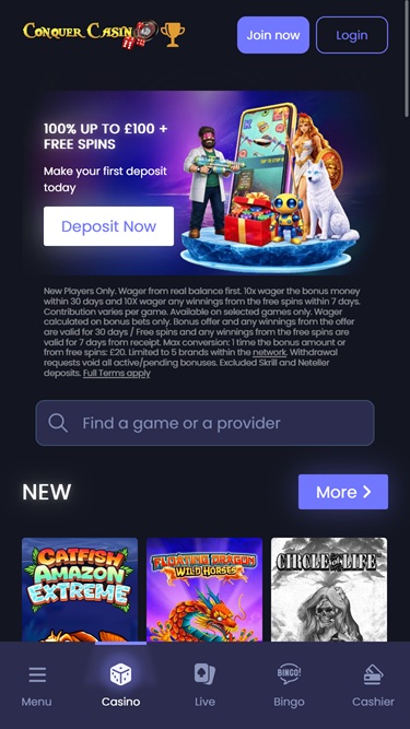 Conquer Casinon takana on Microgaming, Net Entertainment, Playtech, BetSoft, 1x2gaming, Barcrest, Big Time Gaming, ELK Studios, Evolution Gaming, EYECON, Genesis Gaming, Habanero Systems, lightningboxgames, Play'n GO, playson, Quickspin, Rabcat, Rival, Thunderkick, Vivo Gaming, Wazdan, Booming Games, BetConstruct, Pragmatic Play, Nolimit City, IGT, LuckyStreak, Spinomenal, Skillzzgaming, Fugaso, Fantasma Games, Kalamba, Revolver Gaming, Skywind, Triple Edge Studios, Evoplay, Stormcraft Studios, Switch Studios, All41 Studios, TVBet, Gameburger Studios, Pulse 8 Studios, Neon Valley Studios, Super Spade Games, Shuffle Master, SpinPlay Games, Games Global, 2by2 Gaming, Blueprint Gaming, Games Warehouse, Leander Games, NextGen, NYX Interactive, ProgressPlay, Tom Horn Gaming, WMS, Inspired Gaming, Genii, Red7Mobile, CORE Gaming, Scientific Games, Iron Dog Studio, Foxium, Betdigital, Just For The Win, PearFiction Studios, Slingshot Studios, Fortune Factory Studios, Gamevy, Crazy Tooth Studio, ReelPlay, Alchemy Gaming, SimplePlay, Gold Coin Studios and Half Pixel Studios , ja sen kasinopelit tarjotaan verkkopohjaisen alustan kautta. Pelaajat löytävät myös mobiilisivuston, jonka avulla voi pelata sekä älypuhelimilla että tableteilla.