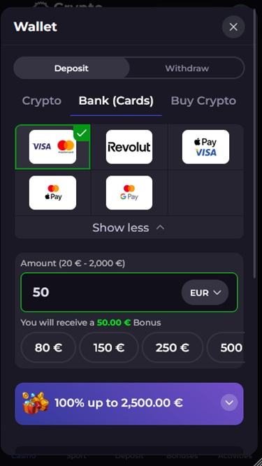 Vankka sivusto - hyvämaineiselta kasinoryhmältä, joka yhdistää urheilun ja kasinon. Paljon kampanjoita - sivusto on samanlainen kuin Nine Casinolla ja Betonredillä - sillä on samat kampanjat ja ominaisuudet, mutta talletukset tehdään vain kryptovaluutoilla.