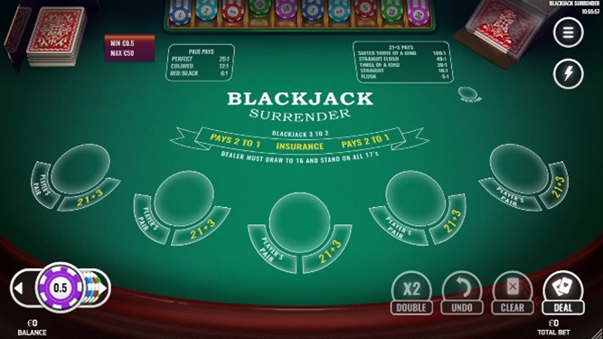 | Blackjack Surrender | Jalusta | Ei | Mitkä tahansa 2 | 1 | Ei | - | - | Kyllä | 99.65% | 6 | Ei |