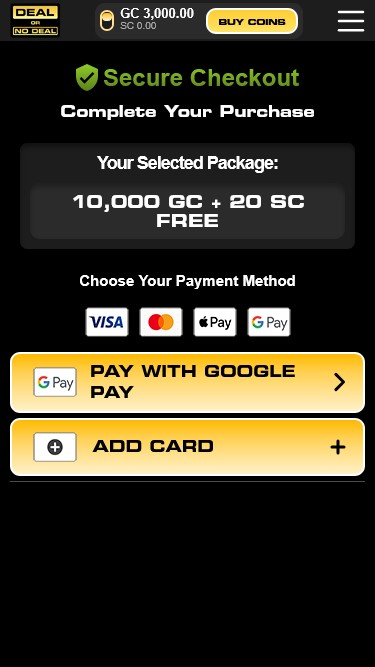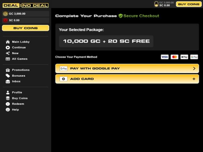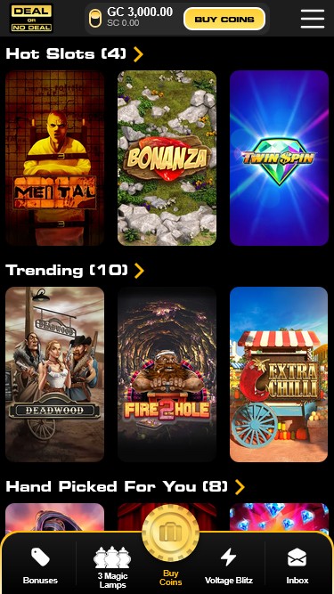 Deal or No Deal Winin kampanja-asetelma on vankka tämän kokoiselle alustalle. Uudet pelaajat saavat rekisteröityessään tervetuliaisbonuksena Gold Coinsia ja Sweeps Coinsia, mikä antaa heille kohtuullisen määrän valuuttaa matkansa aloittamiseen.