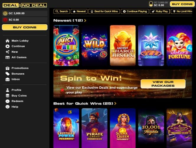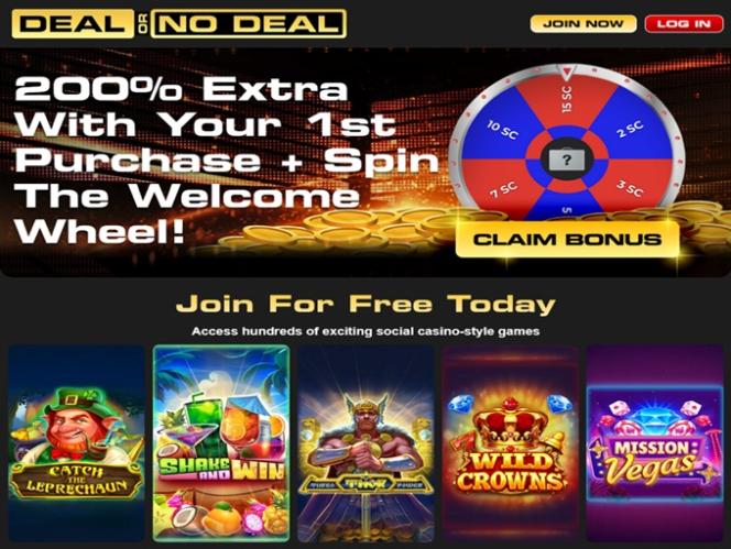 Deal or No Deal Win lanseerattiin vuonna 2024 arpajaisbrändinä, joka tuo legendaarisen peliohjelman jännityksen sosiaalisen pelimaailmaan. Sivustolla on vankka yhdistelmä kasinotyylisiä kolikkopelejä, pikavoittopelejä ja suosittuja live-peliohjelmia. Pelaajat kaikkialla Yhdysvalloissa voivat käyttää alustaa, vaikka useissa osavaltioissa, kuten Kaliforniassa, Connecticutissa, Delawaressa, Idahossa, Louisianassa, Michiganissa, Montanassa, Nevadassa, New Jerseyssä, New Yorkissa ja Washingtonissa, on edelleen rajoituksia.