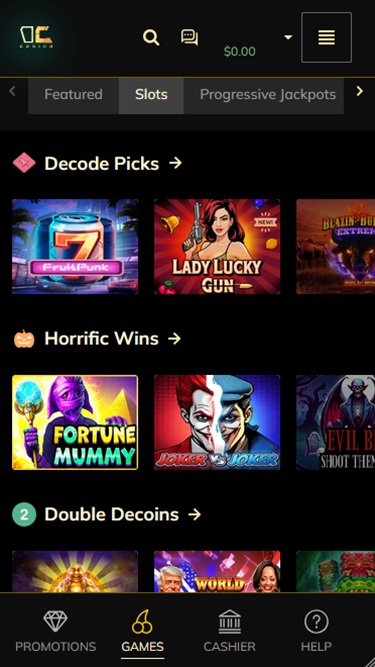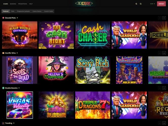Decoden ylläpitämä kolikkopelivalikoima tarjoaa yli kaksituhatta nimikettä. Pelaajilla on mahdollisuus testata ja kokeilla Yhdysvaltoihin sopivia kolikkopelejä , kuten Elvis Frog in Vegas, Fruit Blitz Hold & Win, Hot Triple Sevens, Laughing Buddha, Show Master, Scary Rich 3, Howling Wolves, Fairytale Coven, Big Cash Win, Big Wild Buffalo, Hooked, Sphinx Fortune Hold and Win, Wild Energy, Bonanza Billion, Cycle of Luck Bonus Buy, Wolf Gold, Wheel of Chance II - The Big Wheel, Sweet Bonanza, Joker's Jewels, Johnny Ca$h, Booming Bananas, Book of Tombs, Wild Diamond 7x, Disco Bar 7s ja paljon muuta.