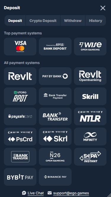 EgoGames on vuonna 2025 perustettu nettikasino, joka on rakentanut valtavan yleisön tarjoamalla laajan valikoiman kasinopelejä ja urheiluvedonlyöntivaihtoehtoja. Pelaajat voivat pelata näennäisesti loputtomalla määrällä nettikolikkopelejä, live-jakajapelejä, pöytäpelejä ja crash-pelejä. Brändi hyväksyy pelaajia Saksasta, Itävallasta, Sveitsistä, Italiasta, Ruotsista ja Irlannista ja kutsuu heidät pelaamaan kaikkia pelejä ja nauttimaan saatavilla olevista kampanjoista ja bonuksista.