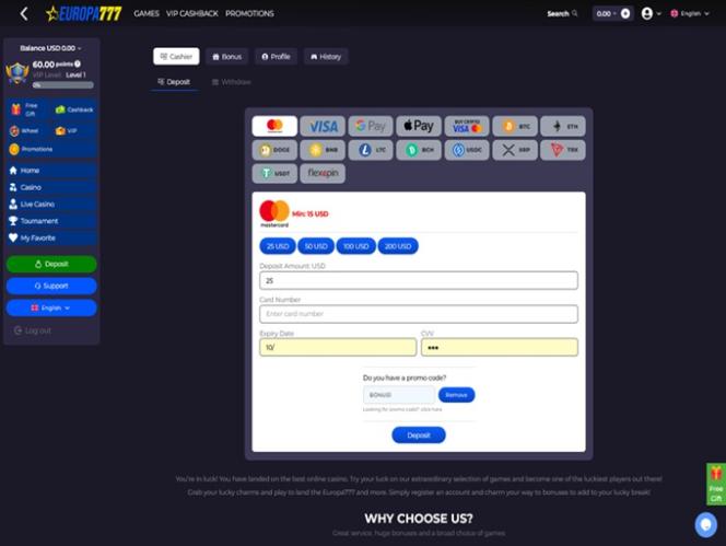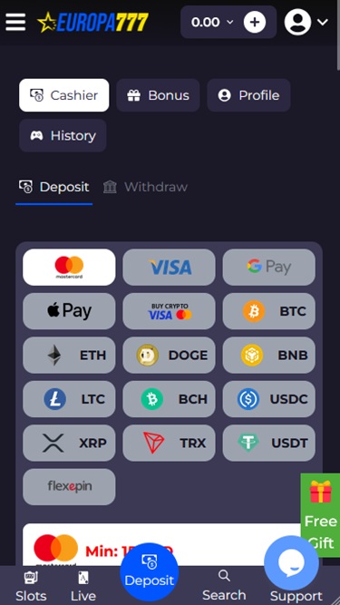 Europa777:ssä on mahdollista tehdä talletuksia ja kotiutuksia fiat-valuutoilla ja kryptovaluutoilla, mukaan lukien suosituilla digitaalisilla kolikoilla , kuten Bitcoin, Bitcoin Cash, Tron, Ethereum, Litecoin, Tether ja paljon muuta.