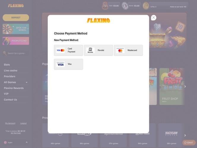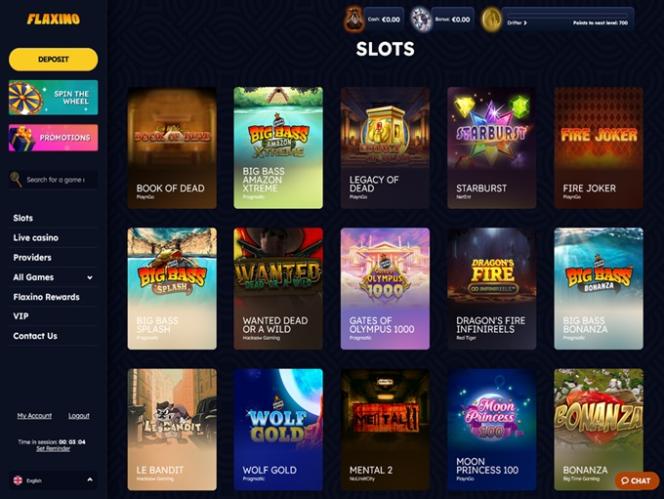 Vasemmalta puolelta löydät valikon, jossa on osiot, kuten talletus, pyöräytä rulettia, hakupalkki, kolikkopelit, livekasino, tarjoajat, kaikki pelit, Flaxino-palkinnot, VIP ja yhteydenotto.