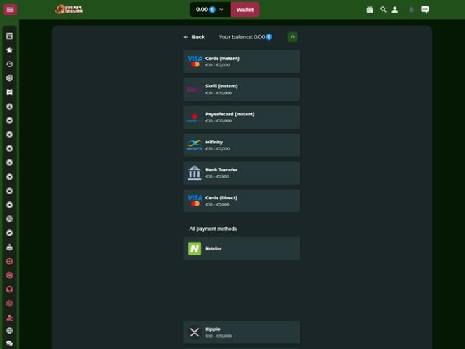 Tällä hetkellä pelaajat voivat pankkipalveluissa hyödyntää Bitcoinia, Bitcoin Cashia, Litecoinia, Rippleä, Tetheriä, Tronia ja USD Coinia , sekä suorittaa maksutapahtumia yleisimpien vaihtoehtojen, kuten pankkisiirron, Visan, Skrillin ja MiFinityn, kautta.