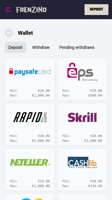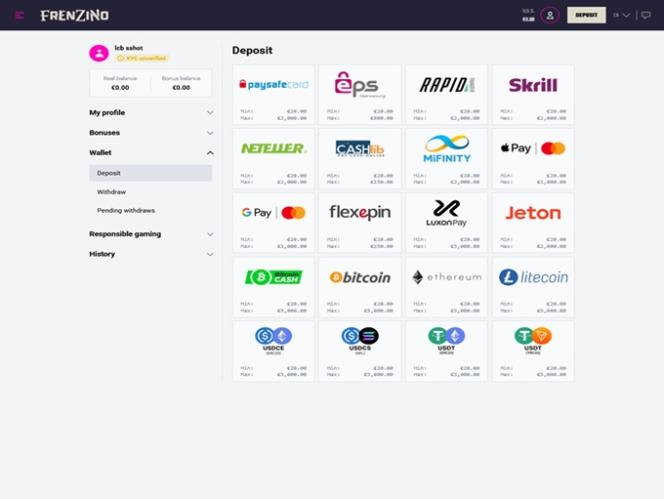 Jos nautit kryptovaluuttojen käyttämisestä talletuksiin ja kotiutuksiin, tulet iloiseksi kuullessasi, että Frenzino hyväksyy useita kolikoita, kuten Bitcoinin, Ethereumin ja USDT:n.