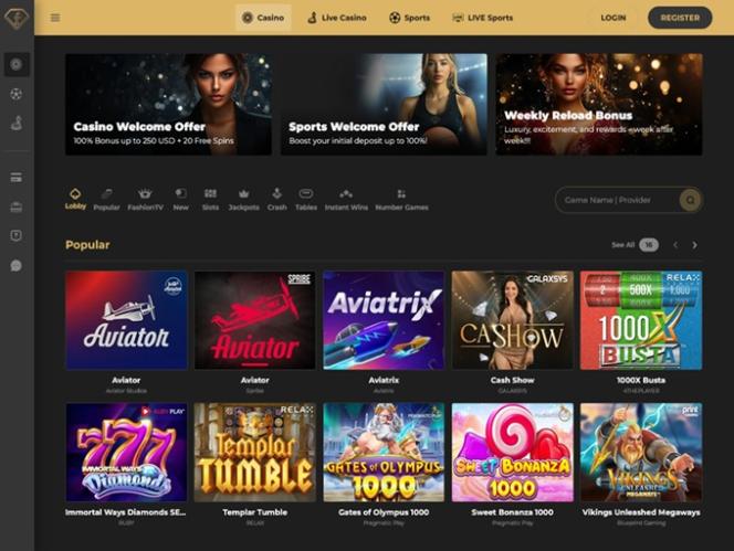 Visuaalisesti verkkosivuston teemassa on houkutteleva väripaletti, joka koostuu tummista taustoista ja kultaisista sävyistä, mikä epäilemättä antaa vaikutelman, että kyseessä on brändi, jonka tavoitteena on tarjota ylellinen pelikokemus. Käyttöliittymä on minimalistinen ja suoraviivainen, mikä tarkoittaa, että kaikkien osioiden ja verkkosivustosivujen selaaminen sujuu ongelmitta.