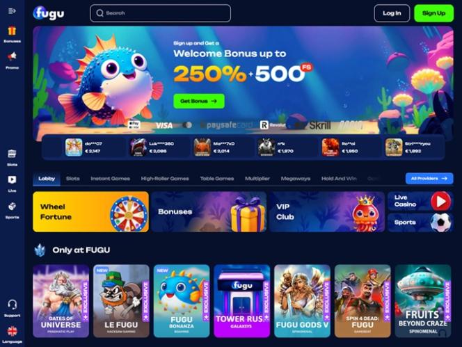 Vuonna 2024 markkinoille tullut Fugu Casino houkutteli suuren yleisön pelaajia Kanadasta, Saksasta, Itävallasta, Sveitsistä ja Irlannista tarjoamalla kattavan luettelon kasinopeleistä, vedonlyöntivaihtoehdoista, kampanjoista ja bonuksista. Brändi tarjoaa valtavan kirjaston kolikkopelejä, live-jakajia, pöytäpelejä ja pikavoittopelejä, mikä tekee siitä täydellisen uhkapelipaikan käytännössä jokaiselle pelaajalle.