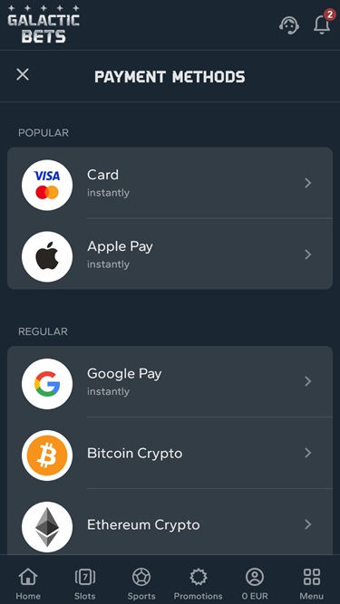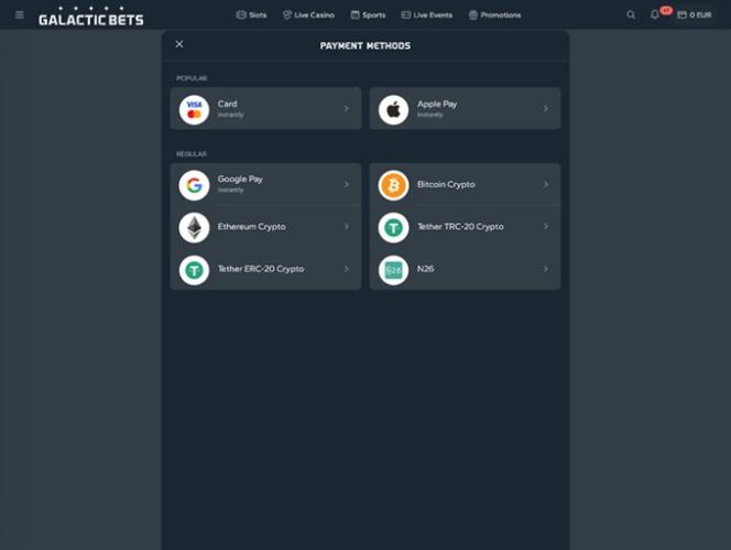 GalacticBets on nettikasino, joka tarjoaa uskomattoman laajan kasinopelivalikoiman, mukaan lukien tuhansia oikean rahan kolikkopelejä, live-jakajien pelejä, pöytäpelejä ja pikavoittopelejä, sekä valtavan urheiluvedonlyöntiosion. Brändi tarjoaa myös lukuisia kampanjoita ja bonuksia ja kutsuu pelaajia Saksasta, Itävallasta, Sveitsistä, Australiasta ja Kanadasta kokeilemaan niitä!