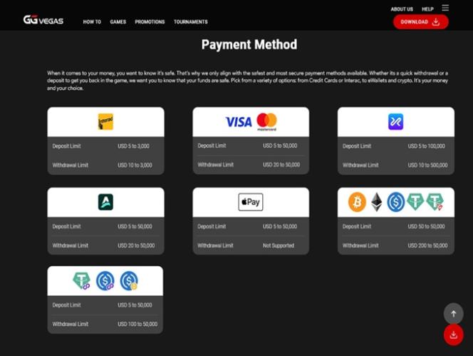 GGVegas Casinolla käytettävissä olevat valuutat ovat Bitcoin ja Yhdysvaltain dollari, ja kryptovaluuttojen lisäksi maksuvaihtoehtoja ovat pankkisiirto, suositut maksukortit, Apple Pay ja muut pankkipalvelut.