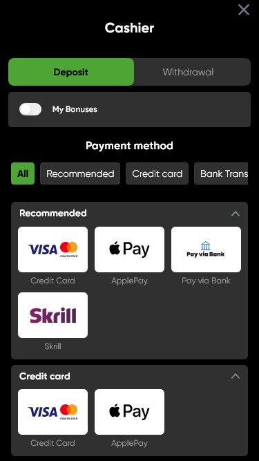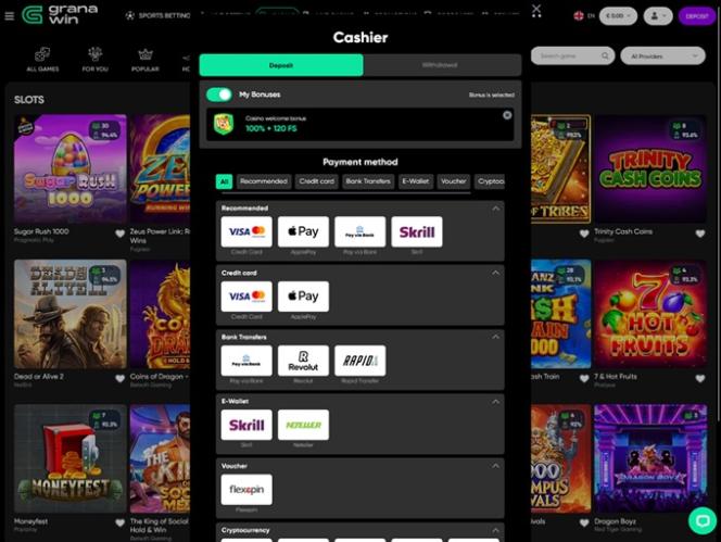 GranaWin on nettikasino, joka hyväksyy lukuisia erilaisia maksutapoja, mukaan lukien erittäin suosittuja vaihtoehtoja, kuten Visa , Mastercard , pankkisiirto, Skrill , Neteller , Apple Pay, Revolut ja Flexepin . Lisäksi pelaajat voivat tallettaa ja nostaa varoja useilla kryptovaluutoilla, kuten Bitcoinilla , Cardanolla , Dogecoinilla , Litecoinilla , Ethereumilla, Solanalla, Tetherillä ja Ripplellä .