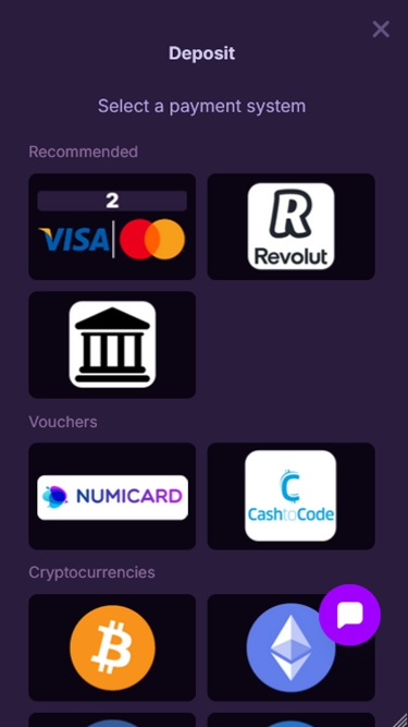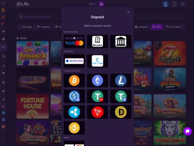 Hit Me Bet Casino on ensisijaisesti kryptopainotteinen nettikasino, mikä tarkoittaa, että pelaajat voivat käyttää useita kryptovaluuttoja tallettaakseen ja nostaakseen varojaan. Joitakin vaihtoehtoja ovat Bitcoin , Bitcoin Cash , Dogecoin , Ethereum , Tron , Tether ja Ripple . Lisäksi verkkosivusto hyväksyy perinteiset maksutavat, kuten pankkisiirrot , Revolut ja Interac .