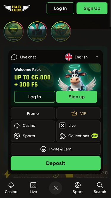 Kasinopelien lisäksi Holyluckilla on myös kokonaan erillinen urheiluvedonlyönnille omistettu sivu, jossa voit lyödä vetoa sadoista urheilu- ja esports-tapahtumista joka päivä. Urheiluvedonlyöntisivusto on varustettu kaikilla tarvittavilla ominaisuuksilla, mukaan lukien live-vedonlyöntiominaisuudet niille, jotka rakastavat toimia milloin tahansa.