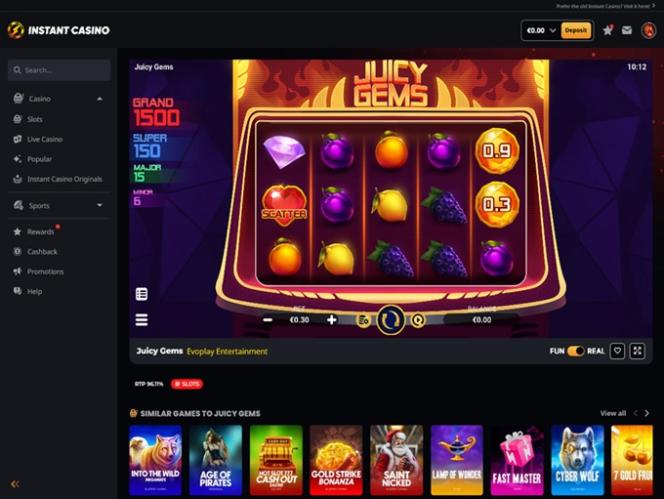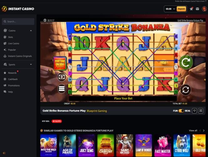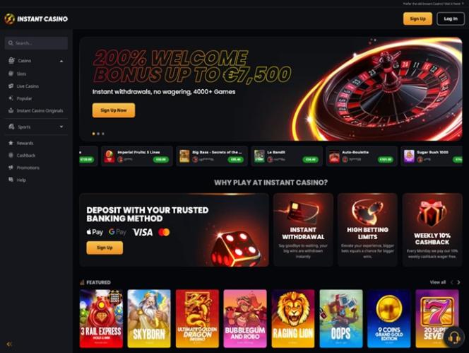 Instant Casino on Curaçaon pelivalvontalautakunnan lisensoima ja sääntelemä nettikasino- ja urheiluvedonlyöntisivusto . Tämän iGaming-brändin pääpaino on pelaajilla Isosta-Britanniasta, Kanadasta, Alankomaista, Saksasta, Ruotsista ja Italiasta, ja sen alusta on lokalisoitu arabiaksi, saksaksi, kreikaksi, englanniksi, espanjaksi, suomeksi, ranskaksi, indonesiaksi ja useille muille maailman kielille, mikä on loistava vaihtoehto kansainvälisille pelaajille.