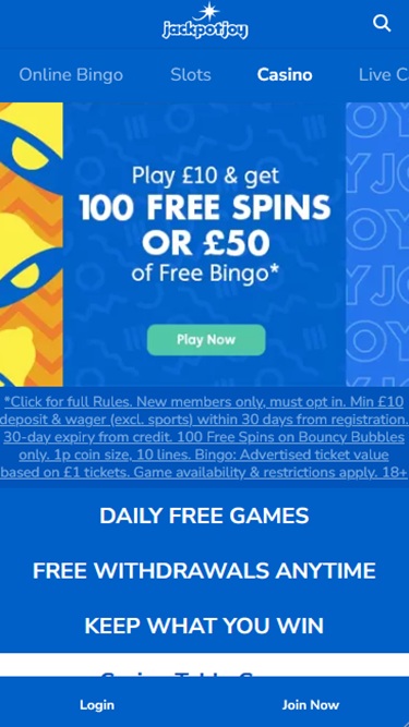 JackpotJoy antaa yhden comp-pisteen jokaista kasinopeleissä panostettua 20 puntaa kohden tai yhden pisteen jokaista bingokortteina ostettua 5 puntaa kohden. Pisteitä voi sitten lunastaa Shop of Joyssa rahana tai arvonnoissa.