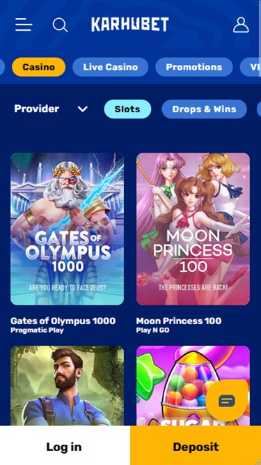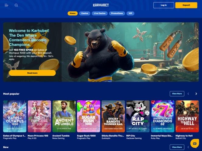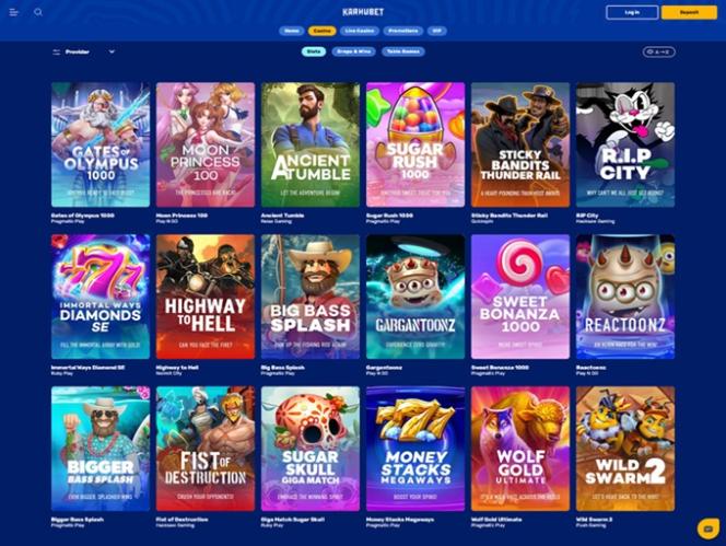 Tämä verkkosivusto näyttää viehättävältä. Siinä on ihana väripaletti, kirkkaat sinisen ja keltaisen sävyt sekä kauniisti tehdyt pelien esikatselukuvat. Vasemmanpuoleinen päävalikko auttaa sinua helposti navigoimaan käytettävissä olevien vaihtoehtojen välillä, kuten Kasino, Livekasino, Kampanjat ja VIP- osiot. Katsotaanpa siis yhdessä, mitä KarhuBet tarjoaa kasinon jäsenilleen saatavilla olevan pelikirjaston ja muiden ominaisuuksien ja palveluiden osalta.