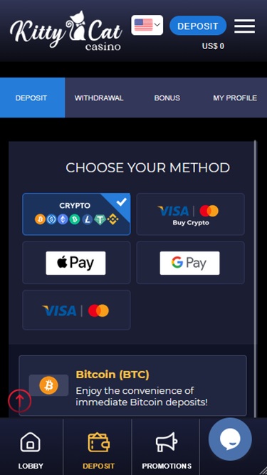 Jos et ole kovin perehtynyt kryptotalletusten tekemiseen, muista tarkistaa Krypto-opas-osio, jossa kaikki prosessin vaiheet on kuvattu yksinkertaisesti ja selitetty parhaalla mahdollisella tavalla, jotta voit tehdä vaivattomasti kryptotapahtumia Kitty Cat Casinolla.