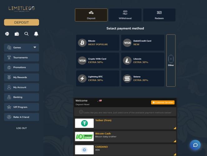 Limitless Casino on pieni, USA-ystävällinen pelibrändi, mutta sivustolla saatavilla olevat kryptomaksuvaihtoehdot ovat moninaiset ja varsin vaikuttavat.