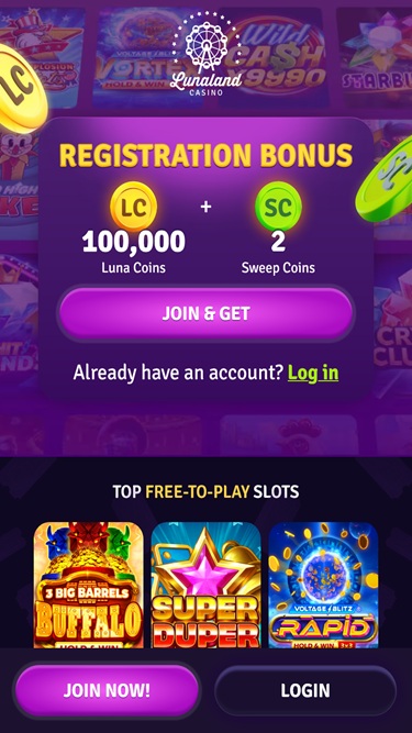 Kuten nykyaikaiselta arpajaiskasinolta voi odottaa, LunaLand tarjoaa pelaajilleen vaikuttavan valikoiman kampanjoita ja bonuksia. Ensinnäkin jokainen uusi tili on oikeutettu lunastamaan tuhdin tervetuliaispaketin, joka sisältää ilmaisen erän Sweeps- ja Luna-kolikoita.