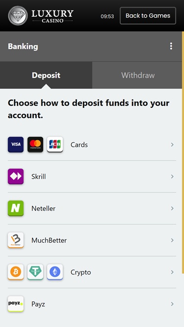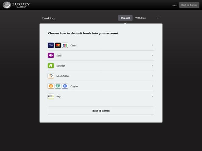 Luxury Casinon pankkijärjestelmä on hyvä, ja sivusto tarjoaa talletuksia luotto- ja pankkikorteilla, e-lompakoilla, pankkisiirroilla ja Paysafecardilla. Nostot käsitellään shekillä, tilisiirrolla ja e-lompakoilla. Maksuaika vaihtelee valitsemasi menetelmän mukaan.