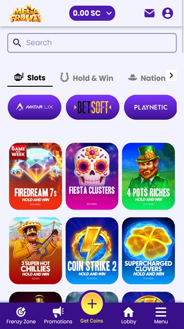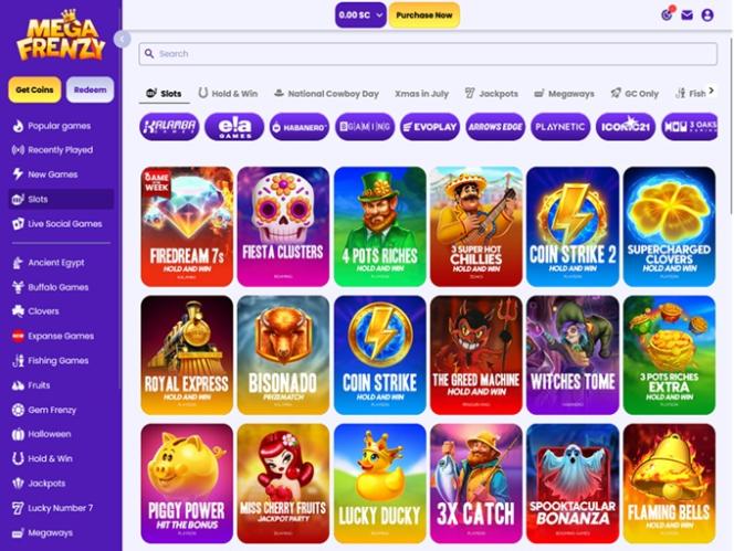 Kuten millä tahansa muullakin modernilla arpajaiskasinolla, Mega Frenzy tarjoaa laajan valikoiman kasinotyylisiä kolikkopelejä, joihin voit sukeltaa. Kirjastosta löytyy kaikki tärkeimmät kategoriat ja genret, mukaan lukien Megaways-kolikkopelit, vanhan koulukunnan julkaisut, uusimmat lisäykset, jättipottikolikkopelit, kalastuskolikkopelit ja paljon muuta.