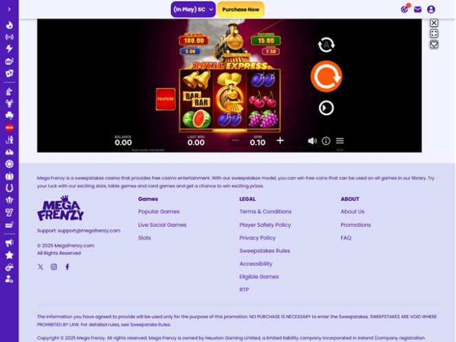 Vuonna 2025 perustettu Mega Frenzy Casino on valtava arvontakasino, joka tarjoaa laajan valikoiman pelivaihtoehtoja: tulet rakastamaan sitä, jos pidät innovatiivisista kolikkopeleistä, kuten Megaways, ja jopa live-jakajapeleistä, kuten Gravity Blackjack ja Sic Bo. Brändi hyväksyy pelaajia Yhdysvalloista (tiettyjä osavaltioita lukuun ottamatta) ja tarjoaa kattavan valikoiman kasinotyylisiä nettikolikkopelejä ja live-jakajapelejä sekä vankan kampanjaohjelman, joka sisältää bonuksia, tapahtumia ja lukuisia muita palkintoja.