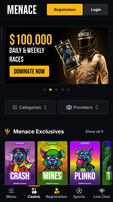 Rekisteröitymisprosessi Menace Kingissä on yksinkertainen ja nopea, minkä jälkeen voit odottaa nopeita maksutapahtumia, tervetuliaisbonuksen, 24/7-tukea, VIP-palkintoja sekä muita bonuksia ja herkkuja. Kaikki tämä oli enemmän kuin tarpeeksi erinomaiseen ensivaikutelmaan, joten olemme juuri tutustumassa kasinon tarjontaan tarkemmin ja pysy kuulolla!