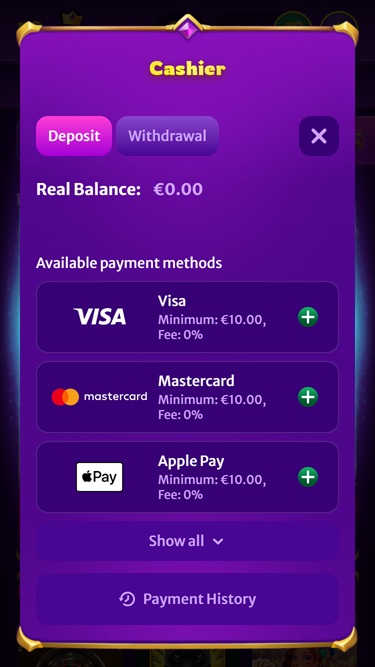 Alusta tarjoaa lukuisia maksutapoja sekä talletuksille että nostoille, mukaan lukien Apple Pay , tilisiirrot, Bitcoin, Bitcoin Cash ja yli kaksikymmentä muuta maksuvaihtoehtoa .