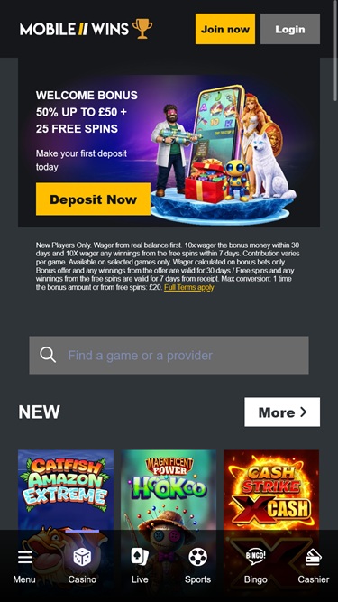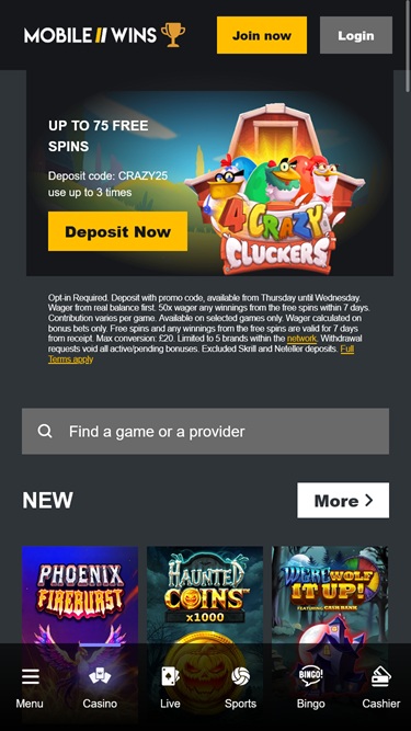 Ei mitään erikoista mobiilivoitoissa, näyttää tulevan samasta ryhmästä (hippo zino hippo drome casino jne.) enkä pidä siellä ryhmästä, superhitaat maksut, verkkosivustot eivät ole mitään erikoista, mutta tylsää. tuki joskus vaikeasti tavoitettavissa tai he ovat vähän "en halua liian auttaa sinua ulos" -moodissa, kuten minä sitä kutsun;) pelivalikoima on hyvä kaikki pelit tarjoajilta! mobiilisivusto myös hyvä toimii nopeasti ilman ongelmia, panostaminen kaikkiin bonuksiin on aivan liian korkea, varmasti piste mikä ei ole houkuttelevaa 50x on korkea, monet muut paikat tarjoavat parempaa palvelua ja pienemmät panokset bonuksille, mutta mobiilivoitot ovat ei huonoin kasino ;)