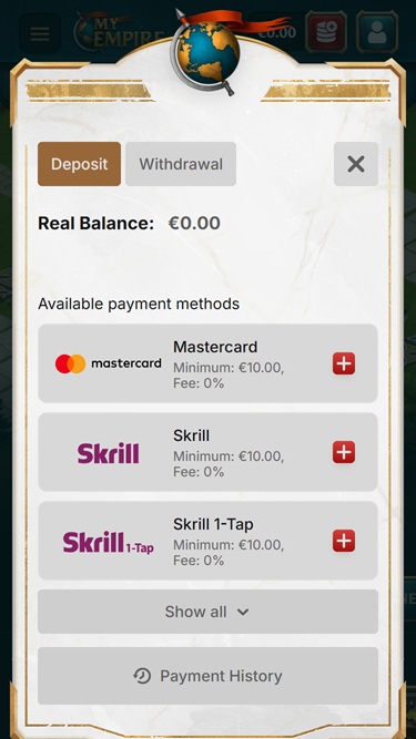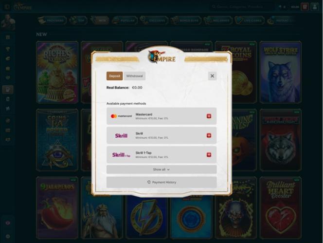 MyEmpiren kassa tukee laajaa valikoimaa maksutapoja, jotka sopivat pelaajien tarpeisiin. Tarjolla on laajalti käytettyjä e-lompakoita, kuten Neteller ja Skrill , maksukortteja, kryptovaluuttapankkivaihtoehtoja ja muita verkkomaksujärjestelmiä, joista valita: