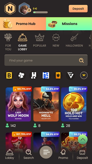 Kategorioihin järjestettyä peliaulaa on helppo selata. Pelejä voi hakea joko genren tai studion mukaan, ja tiettyjen ominaisuuksien, kuten Drops & Wins ja Bonus Buy, mukaan.