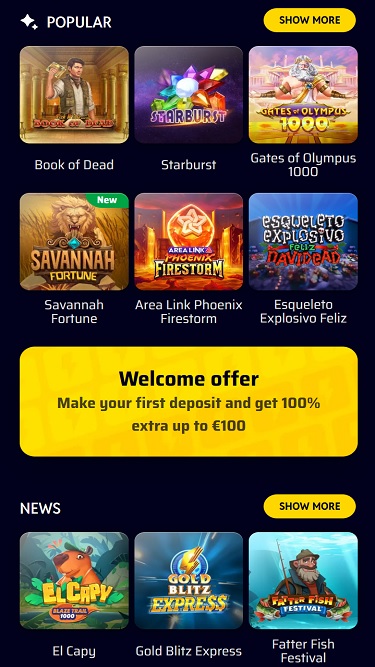 Sinun ei tarvitse ladata mitään lisäsovelluksia. Kirjaudu vain tilillesi mobiiliselaimellasi ja aloita pelaaminen!
