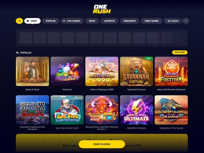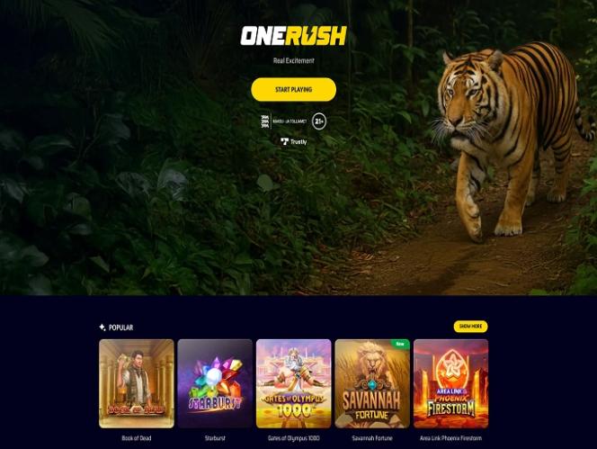 Vuonna 2025 lanseerattu OneRush on nettikasino, joka korostaa laajaa kasinopelivalikoimaansa, joka sisältää satoja huippuluokan julkaisuja, kuten nettikolikkopelejä, live-jakajapelejä ja pöytäpelejä, sekä pienen erän pikakatastrofeja. Brändi hyväksyy pelaajia Suomesta ja Virosta ja kutsuu heidät lunastamaan tervetuliaisbonuksen ja aloittamaan pelikokemuksensa.